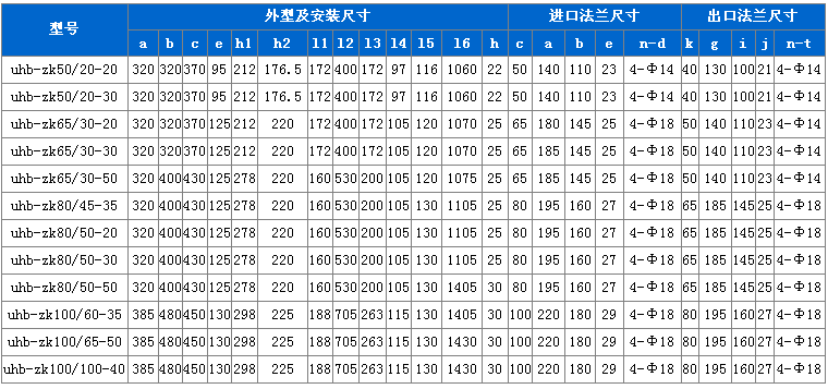 UHB-ZK系列耐腐耐磨泵是一種能適應(yīng)各種不同的工況條件的泵,如輸送酸、堿性清液或料漿;冶煉行業(yè)各種腐蝕性礦漿;硫酸行業(yè)各類稀酸;環(huán)保行業(yè)各類污水等。該泵既耐腐蝕又耐磨損,使用范圍十分廣泛。具有如下特點(diǎn):