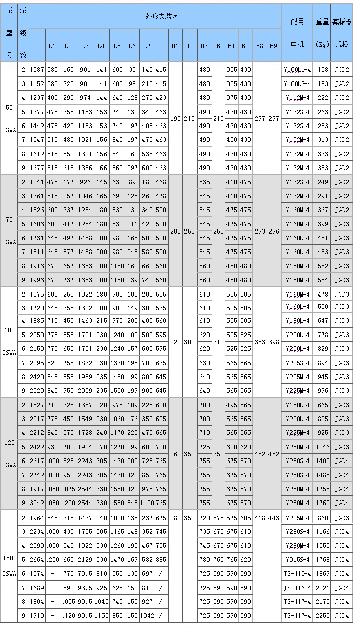TSWA型臥式多級離心泵系列臥式、單吸多級、分段式結(jié)構(gòu),是最新開發(fā)生產(chǎn)的節(jié)能系列產(chǎn)品。具有效率高,運(yùn)行噪音低,抗汽蝕性能好,結(jié)構(gòu)合理,使用壽命長等顯著優(yōu)點(diǎn)。主要輸送清水或物理化學(xué)性質(zhì)類似于水的其他液體。產(chǎn)品執(zhí)行JB/T1051-93《多級離心泵型式與基本參數(shù)》標(biāo)準(zhǔn)