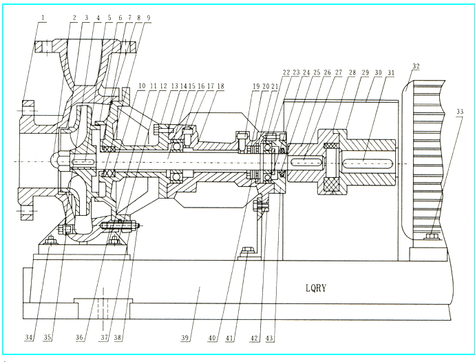 LQRY系列熱油泵是本單位消化吸收國外油泵的基礎(chǔ)上研制的第二代產(chǎn)品,基本結(jié)構(gòu)形式為單級單吸懸臂式腳支撐結(jié)構(gòu),泵的進口為軸向吸入,出口為中心垂直向上,和電機同裝于底座上。