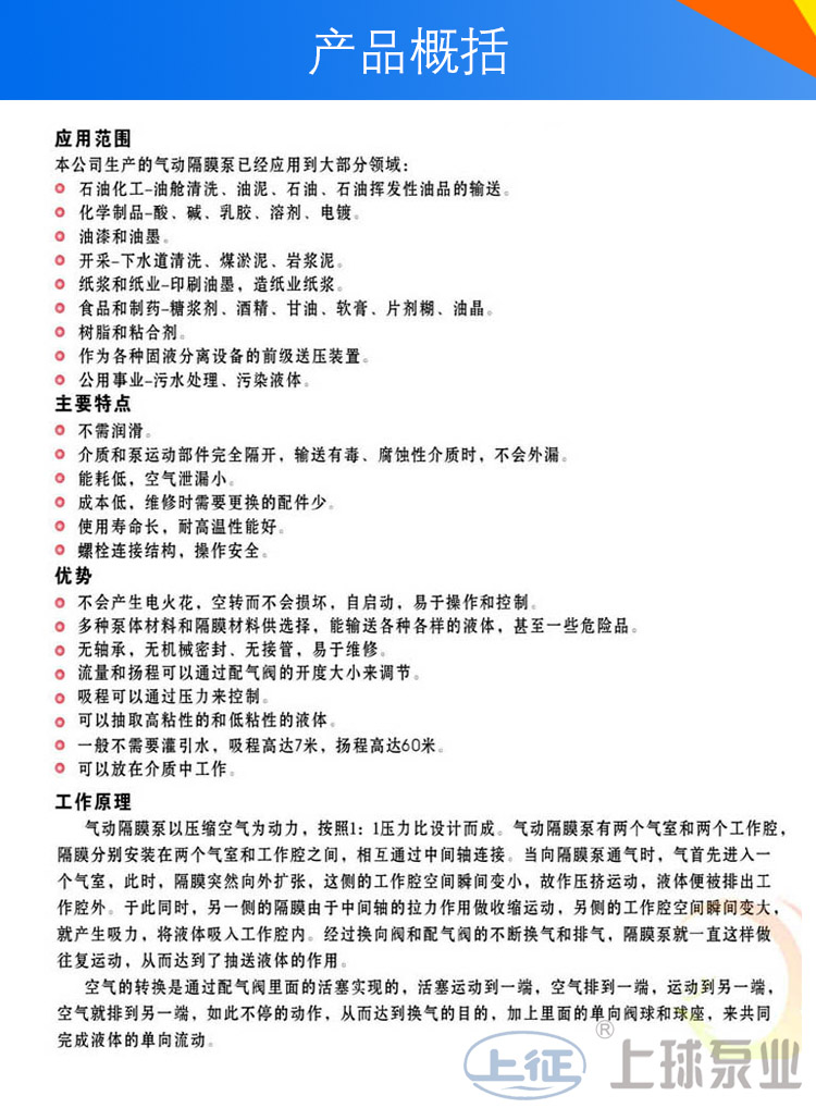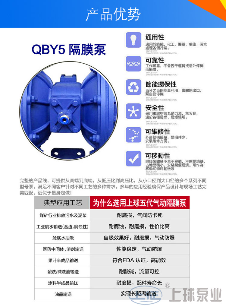 具有使用壽命長、不停機(jī)、無需加油的優(yōu)點(diǎn),即能抽送流動(dòng)的液體,又能輸送一些不易流動(dòng)的介質(zhì),具有自吸泵、潛水泵、屏蔽泵、泥漿泵和雜質(zhì)泵等輸送機(jī)械的許多優(yōu)點(diǎn)。生產(chǎn)的QBY5系列氣動(dòng)隔膜泵是一種新型的輸送設(shè)備,是目前國內(nèi)穎新的泵類。采用壓縮空氣為動(dòng)力源,對于各種腐蝕性液體,帶顆粒的液體,高粘度、易揮發(fā)、易燃、劇毒的液體,均能抽光吸盡。